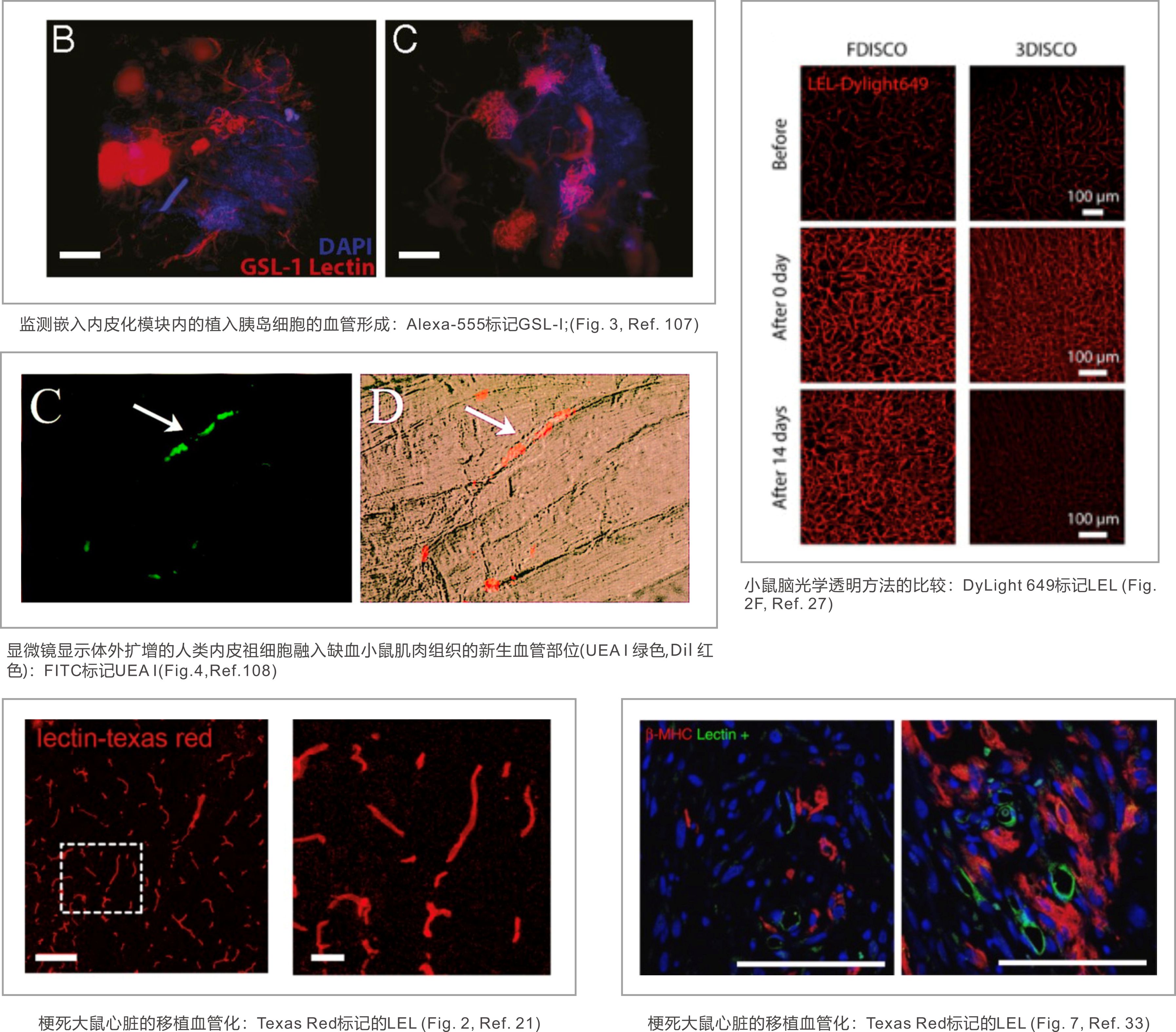 某些凝集素可与血管内皮细胞上的糖链特异性结合,因而常被用于血管的标记和可视化观察。虽然可以用这些凝集素直接对组织切片进行染色,但也可以通过静脉注射带有标记的凝集素,这样可以优先对内皮细胞进行染色,并观察凝集素在血管中的渗漏情况,该操作可以在活体动物或离体组织上进行。番茄凝集素(Lycopersicon esculentum (Tomato) lectin,LEL)对不同小鼠组织的染色就是一个优秀案例,具体可参阅Robertson 等人的研究报告(Ref.89)。由于不同物种内皮细胞上的糖链存在差异,建议针对您感兴趣的物种选择合适的凝集素(如番茄凝集素常用于啮齿类动物),以获得最佳染色信号。有关用于血管成像的不同试剂的更多信息,请参阅 Lokmic 和 Mitchell的研究报告 (Ref.90)。